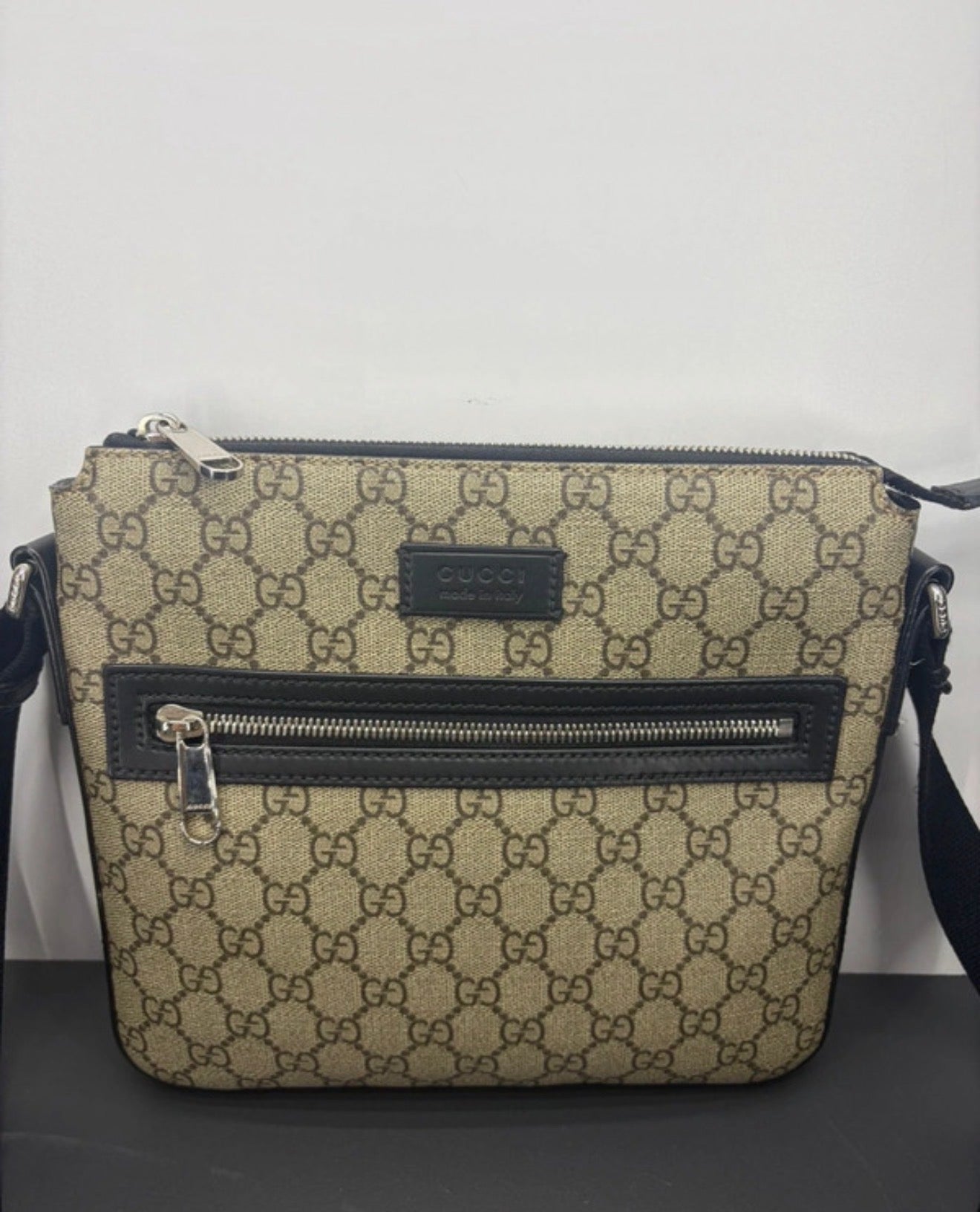 Gucci da uomo in tessuto GG Supreme. La borsa è caratterizzata dalla classica tela rivestita beige/marrone con finiture in pelle nera.