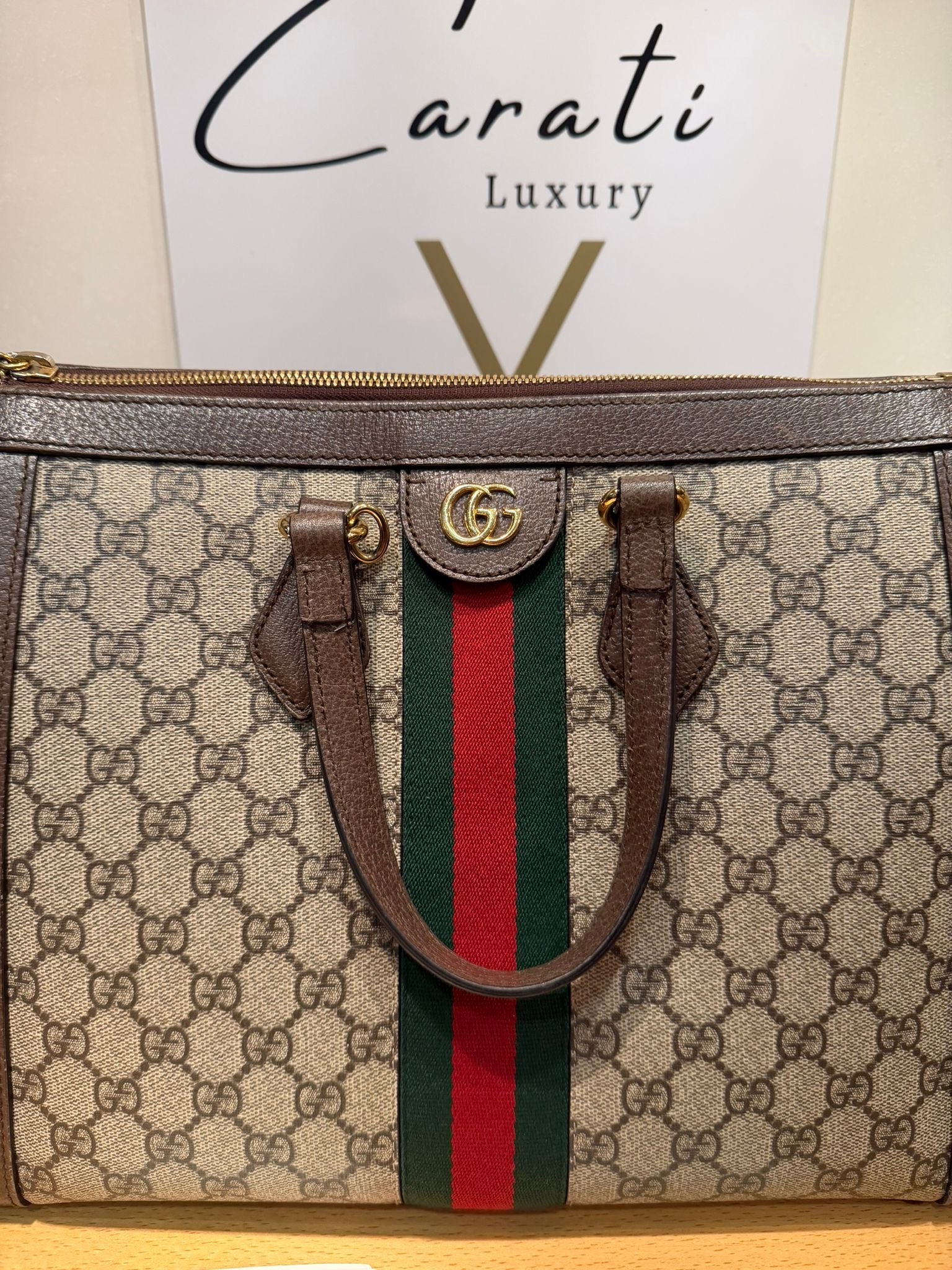 Gucci Ophidia Medium Top Handle Bag (Borsa a mano Ophidia misura media). Questa borsa è realizzata in tessuto spalmato GG Supreme beige ed ebano con finiture in pelle marrone e il caratteristico nastro Web verde e rosso.