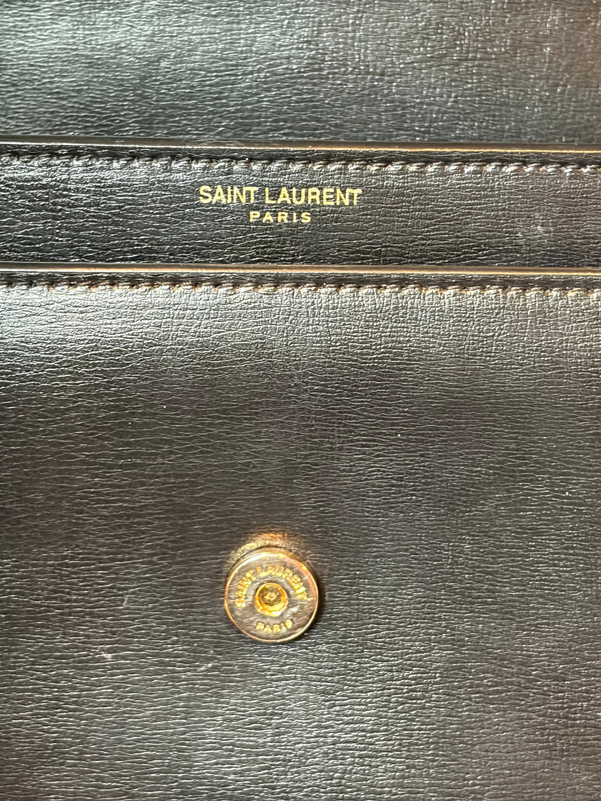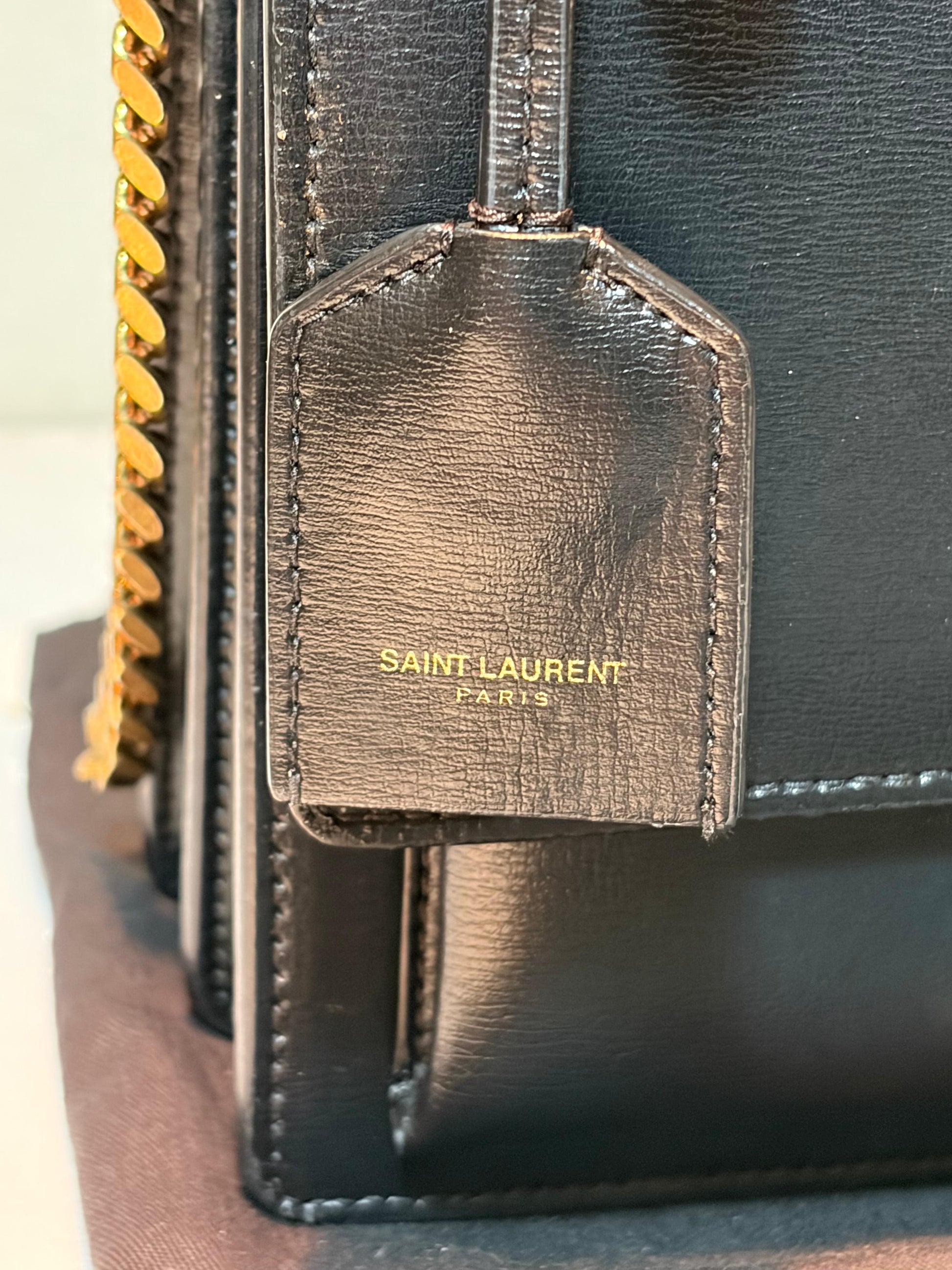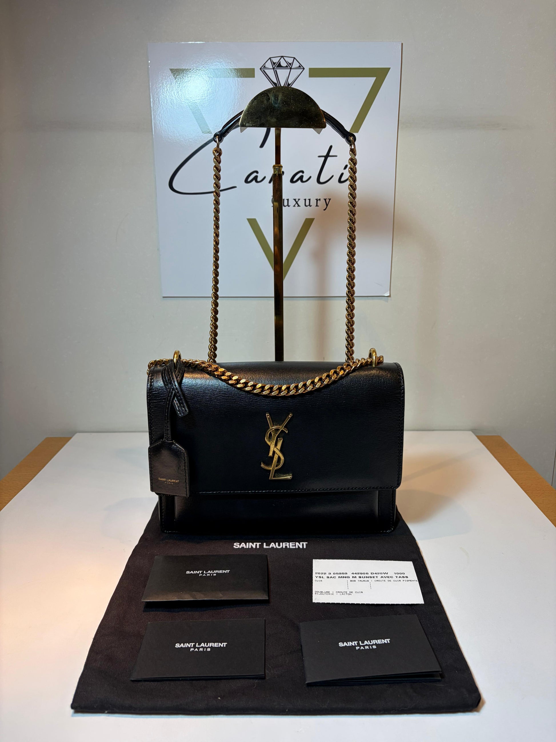 Sunset Medium di Saint Laurent in pelle liscia nera con hardware color oro. È un modello strutturato con lati a fisarmonica e presenta l'iconico monogramma YSL intrecciato sul davanti e un portachiavi in pelle rimovibile.